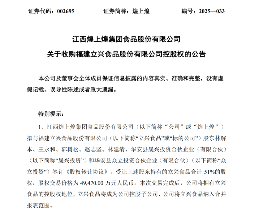 2025年8月,煌上煌以4。95亿元现金收购福成立兴食物51%股权,溢价率高达250%,而这项收购成为其利润增加的焦点“推手”。