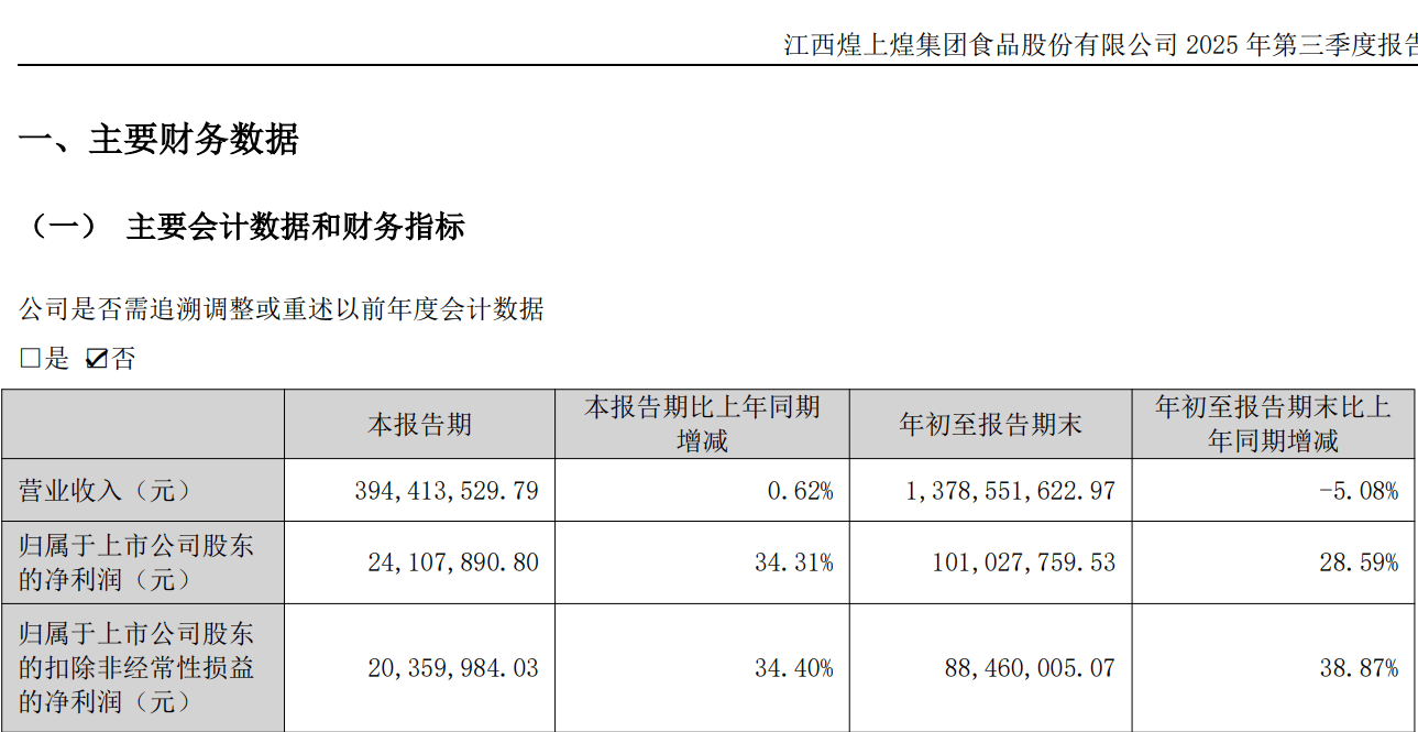 这一现状取公司此前提出的“千城万店”计谋构成明显反差。早正在2023年10月,创始人徐桂芬曾规划“每年开2000家以上门店,3至4年达到10000家”,但抱负照进现实仍有距离,2024年全年净闭店837家,“千城万店”的方针已成镜花水月。煌上煌的业绩压力取市场所作加剧也有所联系关系。红餐财产研究院数据显示,2020-2025年卤味市场规模增速从4。8%降至3。7%,截至2025年4月,全国卤味品牌门店超24万家,合作激烈且消费渐趋。此中,绝味鸭脖门店超万家,紫燕百味鸡超6000家,还有诸多包罗三只松鼠、全聚德、海底捞等从零食、暖锅赛道切入卤味,煌上煌的压力可谓骤增;不只如斯,正在2025年中国餐饮品类红鲤十大品牌中,绝味鸭脖、紫燕百味鸡、周黑鸭位列前三,而煌上煌仅占第4。取持续下滑的营收构成反常反差的是,煌上煌2025年前三季度归属于上市公司股东的净利润持续增加。大望财讯翻阅财报发觉,煌上煌前三季归属于上市公司股东的净利润约1。01亿元,同比增加约28。59%,而这并非源于发卖,而是依赖并购并表、补助的短期操做。