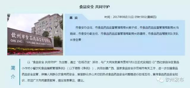 为贯彻《广西壮族自治区食物小做坊小餐饮和食物摊贩办理条例》,建立广西、国度食物平安示范城市,进一步加强我市食物药品平安监管,保障人平易近群众饮食用药平安,钦州市食物药品监视办理局将于2017年8月31日(木曜日)上午9:30—11:00开展“食物平安 配合守护”正在线专题勾当。