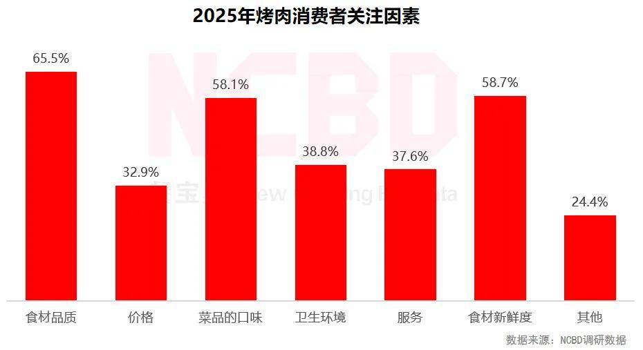 4、从消费者关心要素来看,烤肉消费者对食材质量(65。5%)、新颖度(58。7%)以及菜品口胃(58。1%)最为关心;此外,37。6%的消费者比力注沉办事