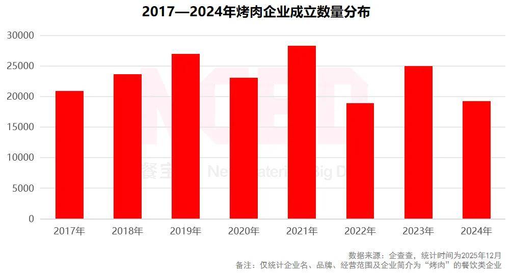 2、截至2025年12月,全国范畴内共有11。6万家烤肉相关餐饮企业;2024年新成立的烤肉企业数量为1。9万;2025年1—11月,新成立的烤肉相关餐饮企业数量达1。5万