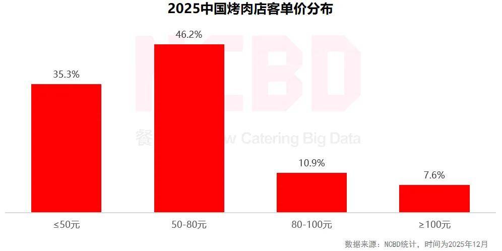5、从客单价来看,46。2%的烤肉店客单价正在50—80元之间;35。3%的烤肉店客单价低于50元;7。6%的烤肉门店客单价高于100元