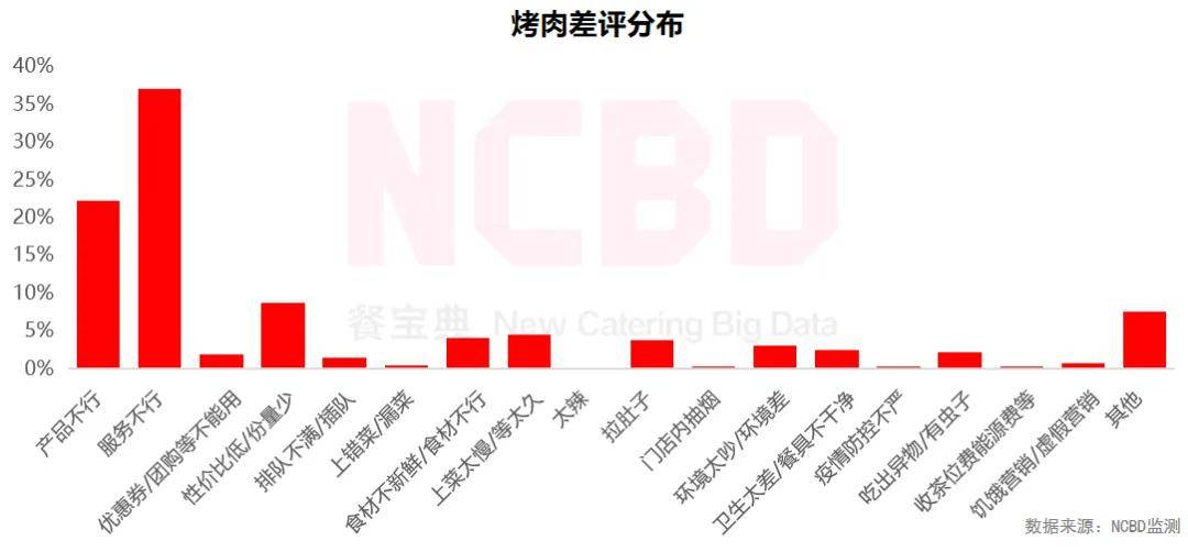 5、正在关于烤肉的差评中,办事方面差评最多,占比高达37。0%,远高于烧烤烤串;此外,产物、性价比以及食材方面也收成了较多差评