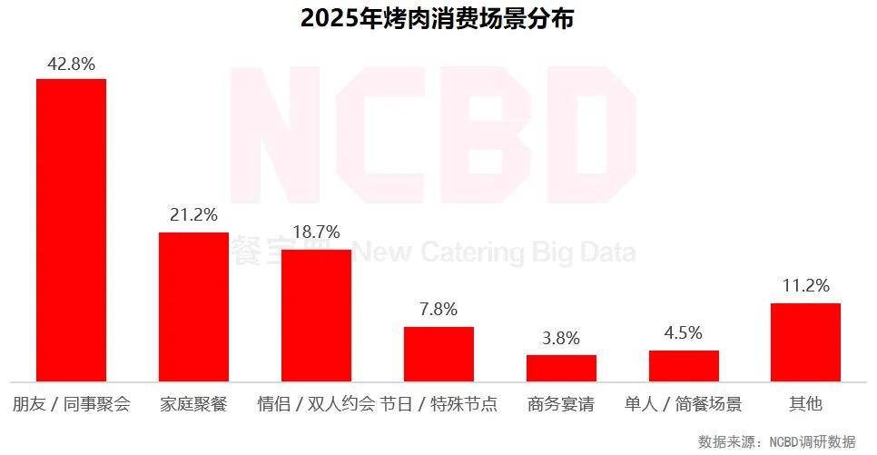 3、烤肉具有明显的社交属性:伴侣/同事会餐占比42。8%,家庭会餐占21。2%,情侣/双人约会占18。7%,商务宴请的比例仅为3。8%