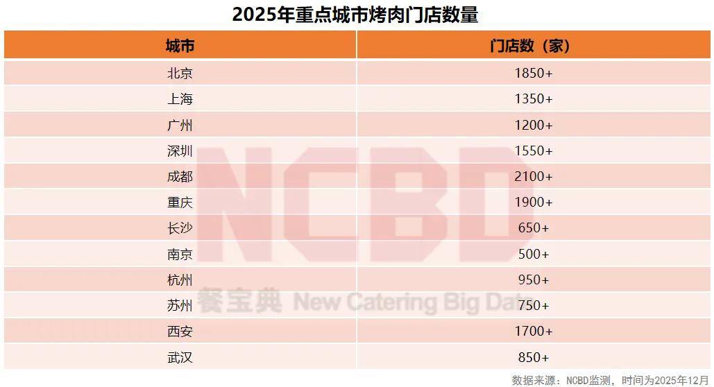 4、从沉点城市的烤肉门店数量来看,川渝地域烤肉店数量最多,此中成都的烤肉店更是跨越了2000家;此外,、西安的烤肉店也跨越了1700家,正在全国处于领先程度;广州烤肉店正在一线城市中数量起码
